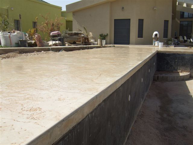 ריצוף " קצה מושלם" בהטבעה דמויית סלע, סביב בריכה, בגוון אדמדם